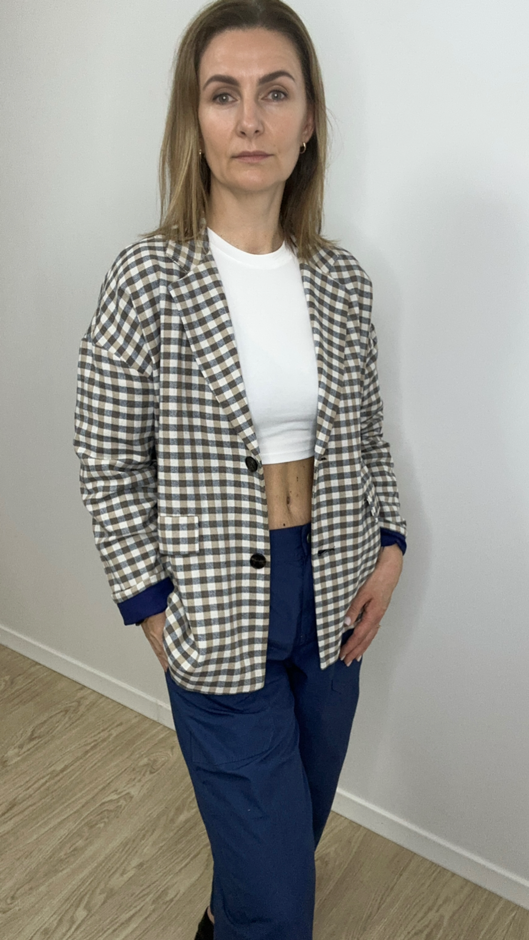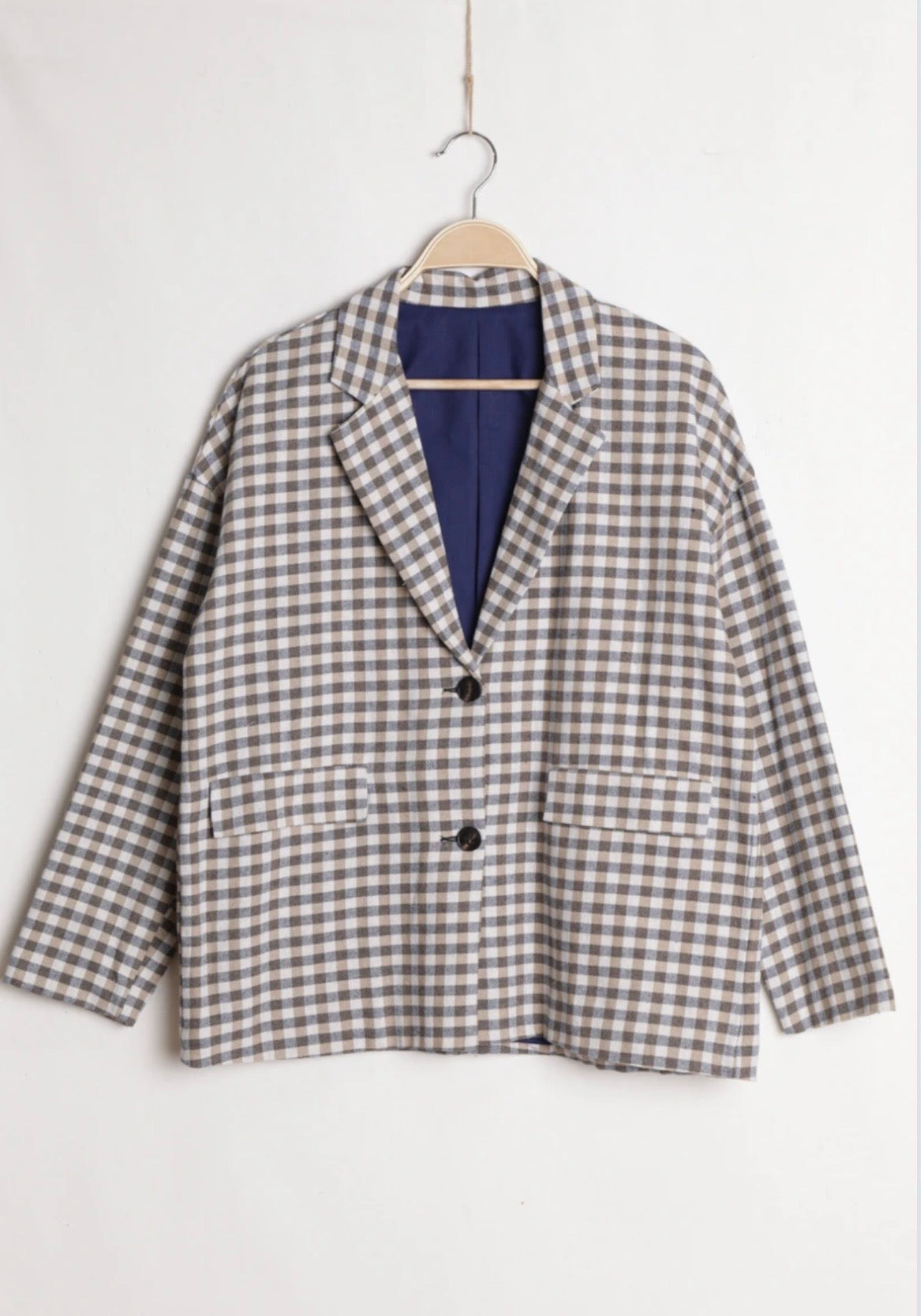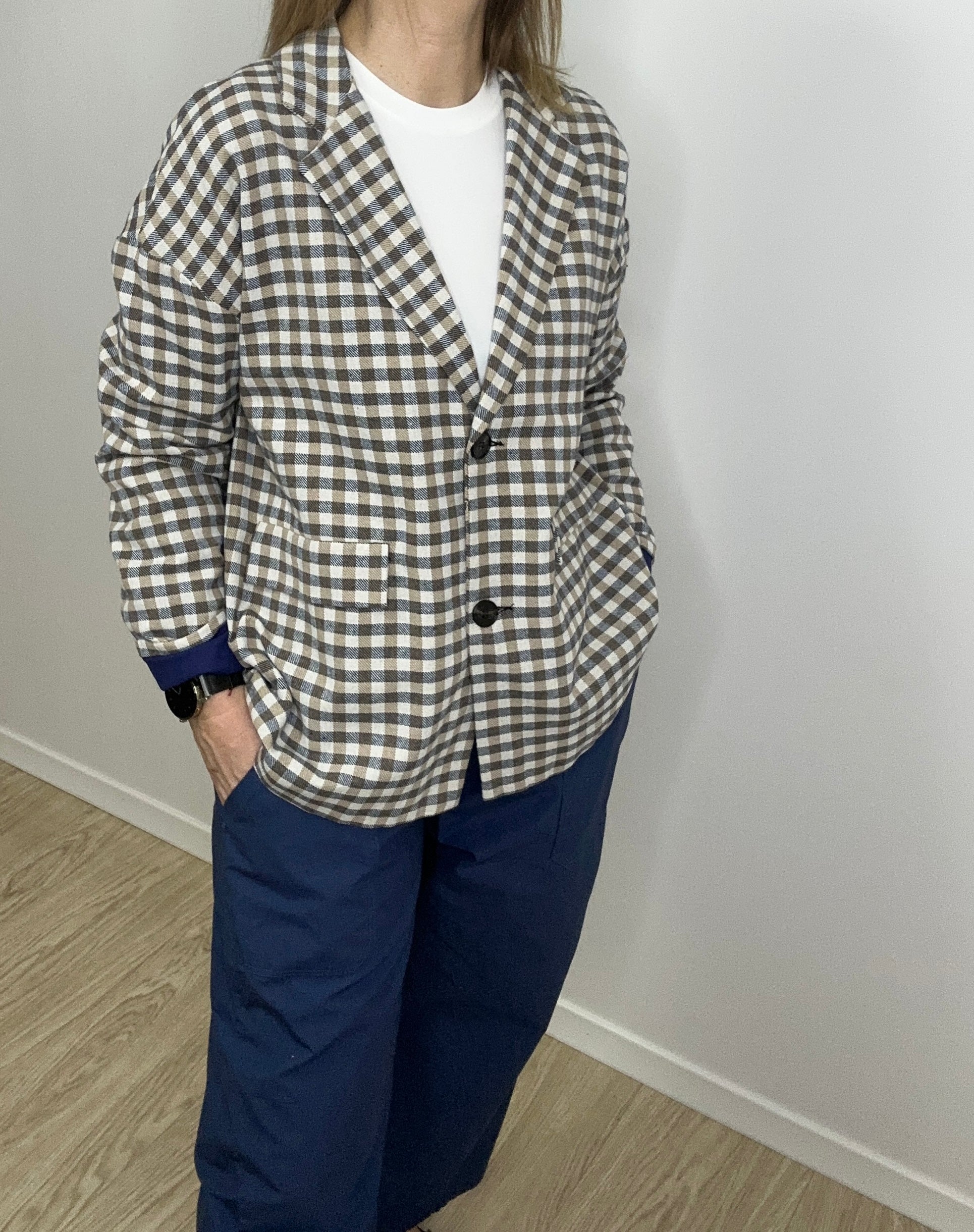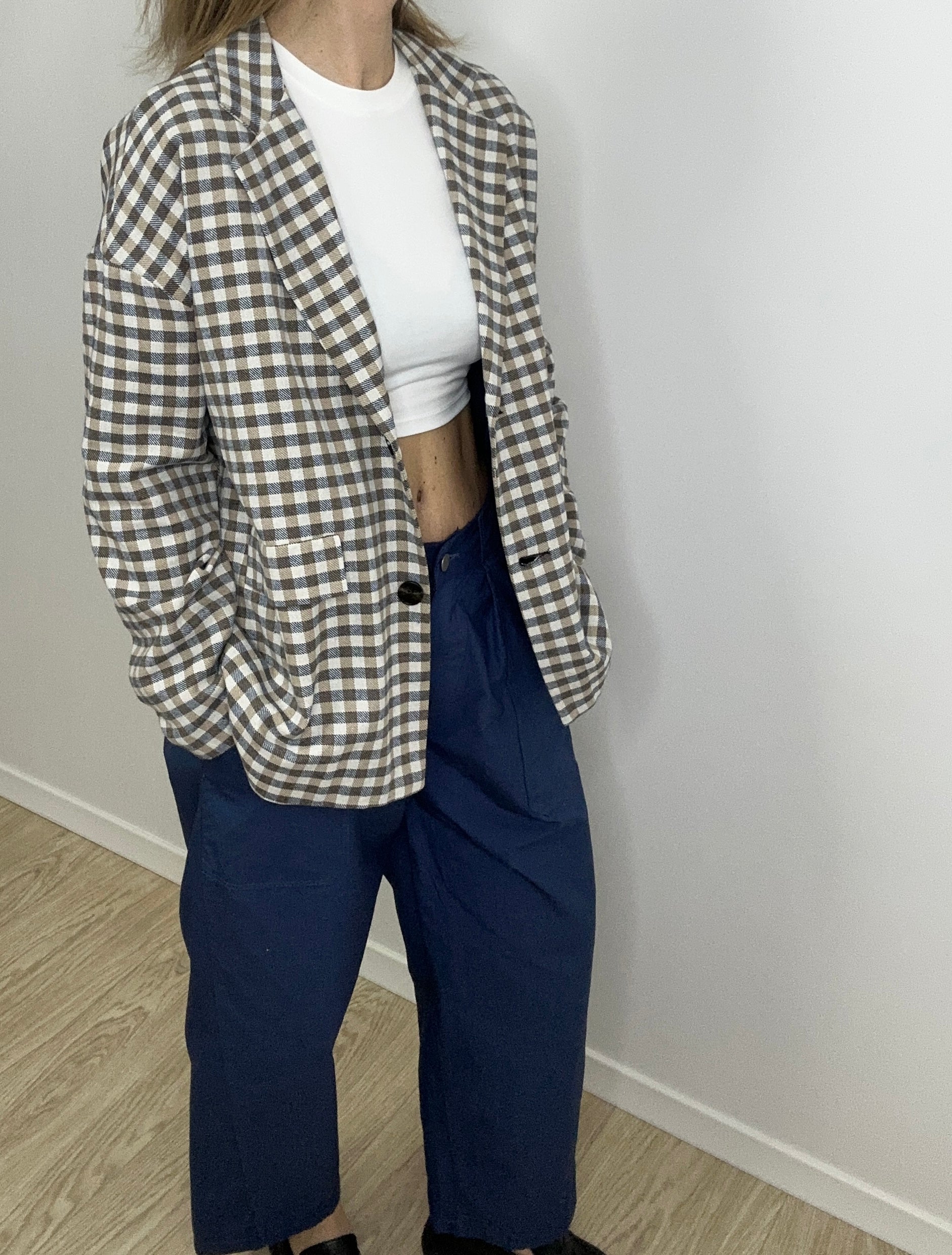 Stilingas ir lengvai derinamas švarkas su subtiliu languotu raštu – puikus pasirinkimas pavasario ir vasaros sezonui. Laisvesnio silueto modelis suteikia patogumo ir elegancijos, o klasikinė apykaklė bei dvi priekinės kišenės sukuria tvarkingą ir modernų įvaizdį. Švarkas puikiai tiks tiek prie džinsų kasdienai, tiek prie suknelės ar kelnių elegantiškesniam deriniui.